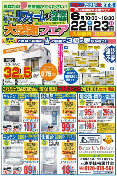 代表親方ブログ6月22日(土)6月23日(日)元気いっぱいリフォーム・外壁塗装大応援フェア元気いっぱいリフォーム大応援フェアを開催します。お得な情報満載ですので、是非ご来場下さい♪日にち6月22日(土)6月23日(日)場所育良町 タカラスタンダートショールーム2024-06-19 14:30無料お見積はこちら