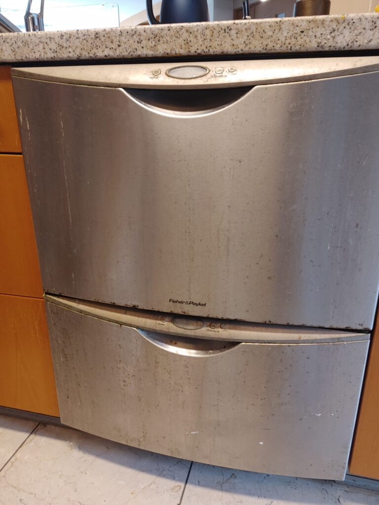 お客様のキッチンは、フルオーダーのシステムキッチンで、【ミーレ】というメーカーの二段式の特殊な食洗機が設置されていました。ご覧ください。