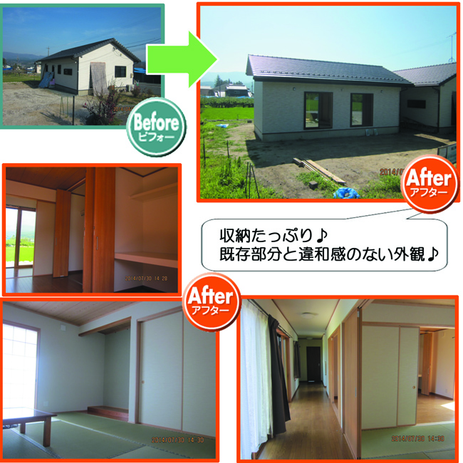 施工事例増築工事 飯田市 駄科 Y邸既存の建物の裏へ増築工事を行いました♪ご希望の収納をたっぷり作り、お客様がいらっしゃっても安心して泊まっていただけます。ポイント収納もたっぷりで、お客様がみえても安心です。無料お見積はこちら