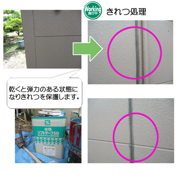 続いて、外壁の亀裂を埋めます。ALCパネルは、基本的には窯業系サイディングと同じ材料で塗装しますが、目地にコーキングを行いません。