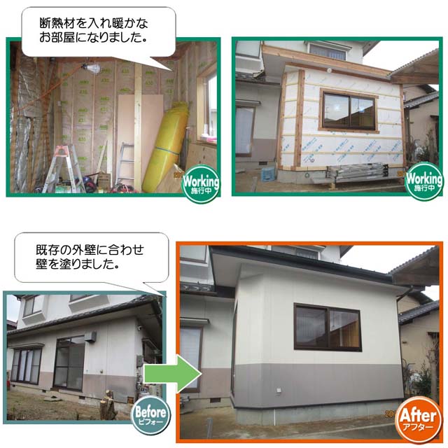施工事例飯田市上郷U邸 増築工事増築工事を行いました。基礎・構造工事をしっかり行い、断熱もしっかり行ったので、暖かいお部屋が出来たと喜んでいただけました。ポイント増築し、部屋を広くしました無料お見積はこちら