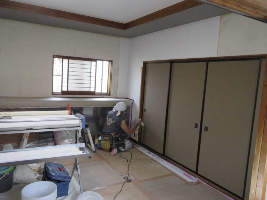 大工さんが、2日間かけて床を貼り終えると、次は壁紙張り替えです。古い壁紙を全て剥ぎ取り、下地処理をしてから、新しい壁紙を貼っていきます。壁紙の張替えは、この下地処理に時間を大分要します。壁紙の張替えの出来具合を左右する重要な工程です。