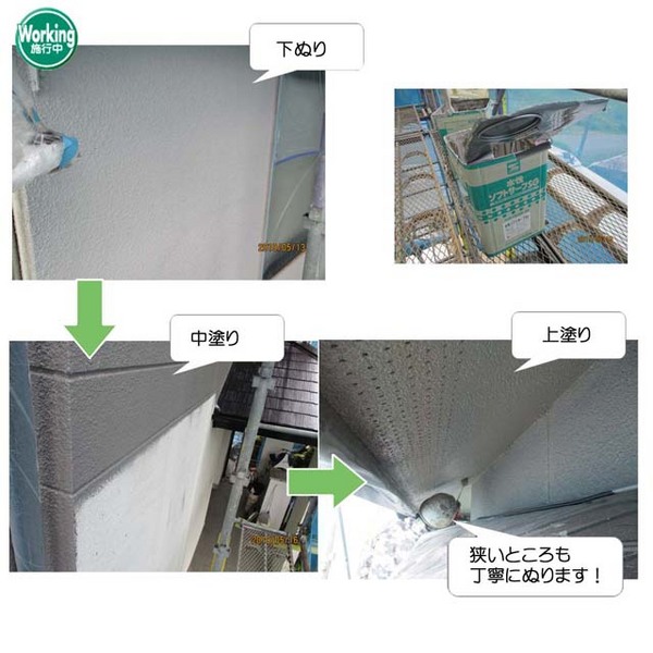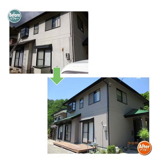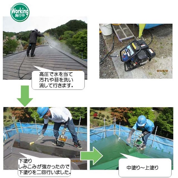 塗装工事丁寧な下塗りで防水性アップ☆屋根外壁塗装こんにちは飯田市のリフォーム屋さん 恵夢住宅設計室の田中です。今日は飯田市で、外壁塗装を行ったM様邸を紹介します。M様邸は、コロニアル屋根、モルタル外壁の住宅です。経年劣化で、防水性が無くなり、雨などの水の吸い込みが心配な状態でした。屋根は、コロニアルでしたが、水の吸い込みが多かったので、下塗り材を二回塗っています。外壁の塗装の様子です。完成の様子です。屋根は鮮やかなグリーンになりました。無料お見積はこちら