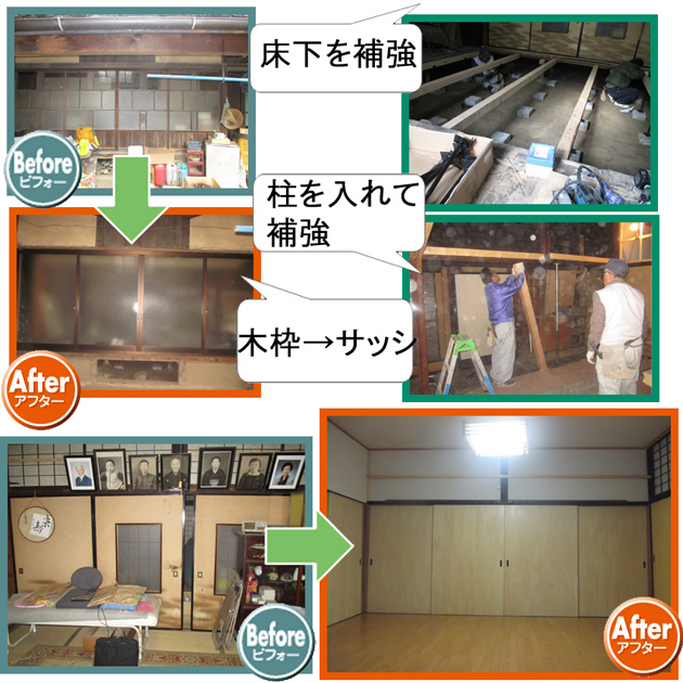 室内リフォーム工事洋室リフォーム工事 喬木村M邸以前使われていた離れを、居間の生活に合うように、畳→フローリングに変更しました。傷んでいた床下や、柱などを補強し、安心して使っていただけるお部屋になりました。ポイント今の生活に合ったフローリングに変更しました。無料お見積はこちら