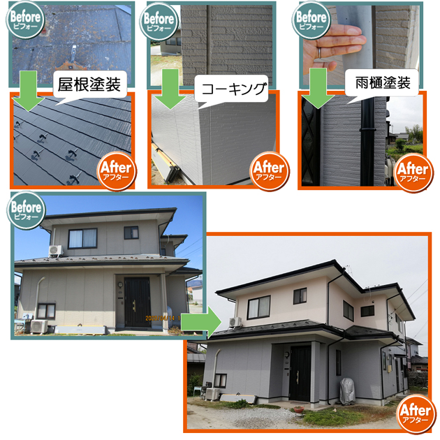 外壁塗装飯田市中村N邸 屋根外壁塗装リフォーム工事屋根:コロニアル 壁:窯業系サイディング 屋根のコロニアルは、雪止めに錆が見られ、一部苔の見られるところもありました。外壁のコーキングは打ち替えを行い、外壁は上下に塗り分けを行いました。ポイント一回と二階で色を塗り分け、明るいイメージになりました。無料お見積はこちら