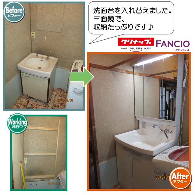 施工事例飯田市今宮町K邸 洗面化粧台設置工事下台だけだった洗面台を クリナップ ファンシオに交換しました。壁に下地を作り、三面鏡部分も取付け、収納たっぷりの洗面台になりました♪ポイント下地を組み、三面鏡を取り付けました。無料お見積はこちら