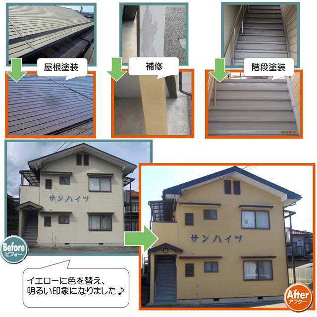 外壁塗装飯田市鼎 アパート外壁塗装リフォーム工事カラー鉄板の屋根、窯業系サイディングの外壁のアパートの塗装工事を行いました。外壁には、はがれやクラックがみられたので、丁寧に補修して、三度塗りを行いました。目地部分のコーキングは全撤去を行い、専門の職人によって打ち直しを行いました。ポイント明るいイエローに色を変え印象が変わりました♪無料お見積はこちら