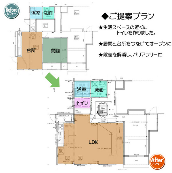 段差だらけで、間仕切りで細かく区切られていた、キッチンと居間を、一つの空間にします。