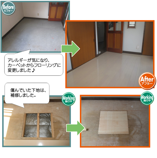 室内リフォーム工事飯田市M邸 内装リフォーム工事カーペット敷きの洋室を、アレルギーが心配との事で、フローリングにするリフォームを行いました。 カーペットをはがした後で、傷んでいた部分は撤去し、下地を張り替えました。ポイントカーペットからフローリングになり、ホコリを気にせず生活できるようになりました♪無料お見積はこちら