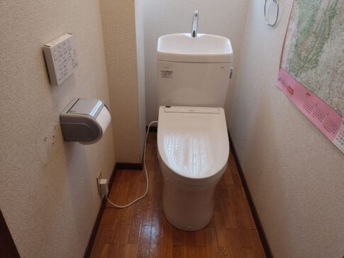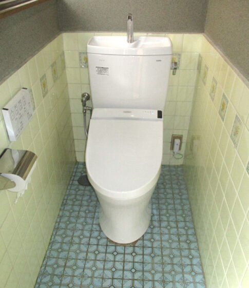 トイレリフォーム工事便器の入れ替えリフォームを行いました。トイレ内にあった洗面器をなくし、手洗い付きのトイレにしました。また、今までついていなかった、脱臭ウォシュレット機能付のものになりました。 ポイント 便器の入替えを行いました。