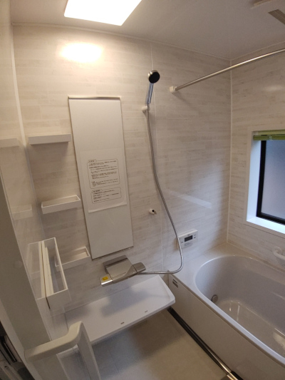 施工事例浴室のリフォーム工事を行いました。システムバスの入替え工事となり、出入り口にはもともと段差はありませんでしたが、折れ戸を引き戸に変更し、更に安全な仕様に変更しました。 ポイント バリアフリーのお風呂になりました。