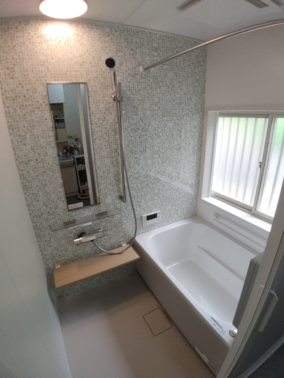 施工事例タイルのお風呂を、タカラスタンダード「グランスパ」にリフォームしました。脱衣室との間の土台などの木材は新しいものと入替え、安心して入れる断熱性の高い暖かいお風呂になりました。 ポイント 明るく暖かいお風呂になりました。