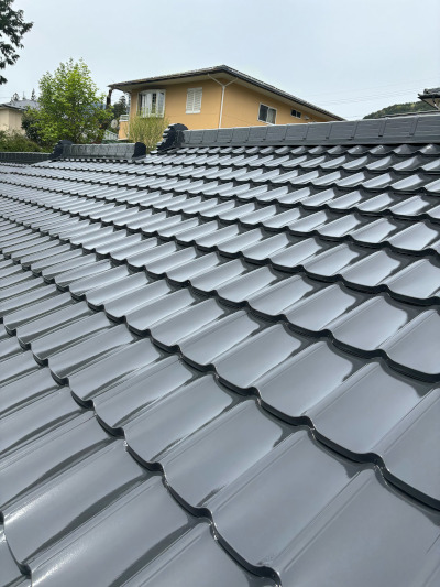 屋根塗装瓦型の板金屋根の塗装工事を行いました。瓦のように見えますが、軽く構造的に有利なのが特徴です。板金屋根ですので本瓦と違い、定期的な塗り替えが必要となります。 ポイント 瓦型の板金屋根の塗装を行いました。