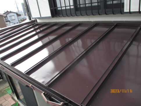 屋根塗装カラー鉄板屋根の塗装を行いました。以前の塗装が浮いてきていたので、丁寧に研磨を行い、三度塗りを行いました。 ポイント 塗装が浮いていた箇所があったので、丁寧に研磨を行いました。