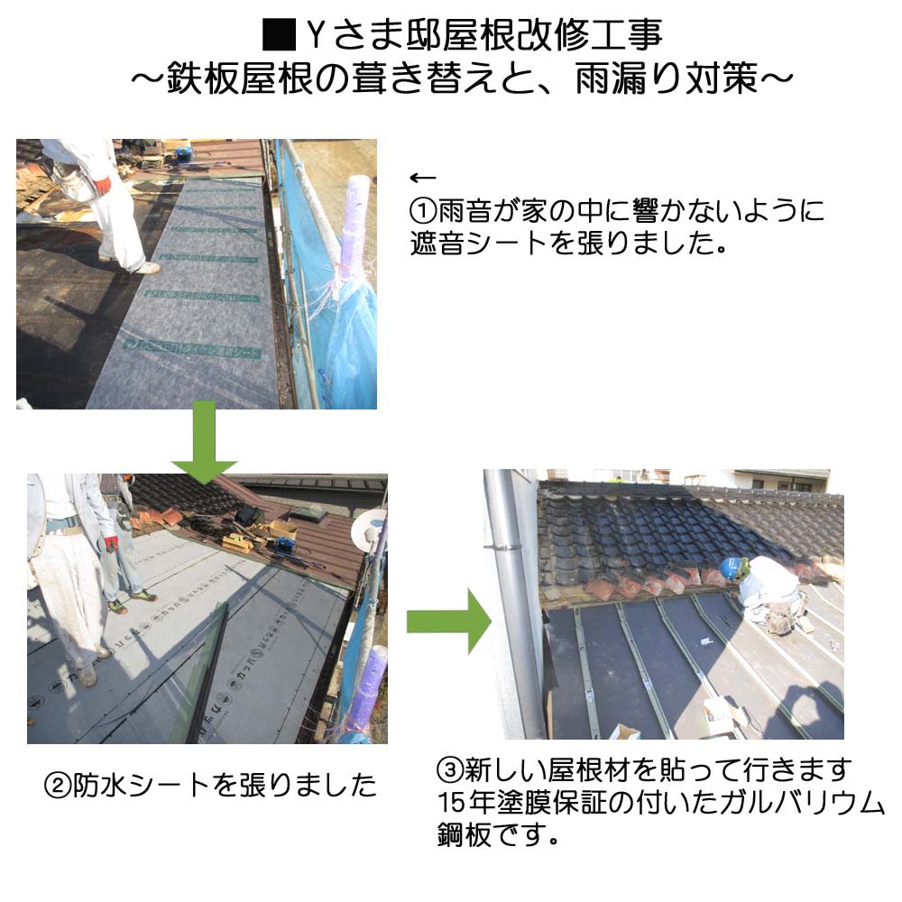 鉄板屋根は、現在はさびの出にくいガルバリウム鋼板を使うのが主流ですが、以前の屋根は錆やすく、Y様のお宅でも屋根にさびが目立ち、寿命だったので塗りかえずに、新しく葺き替えました